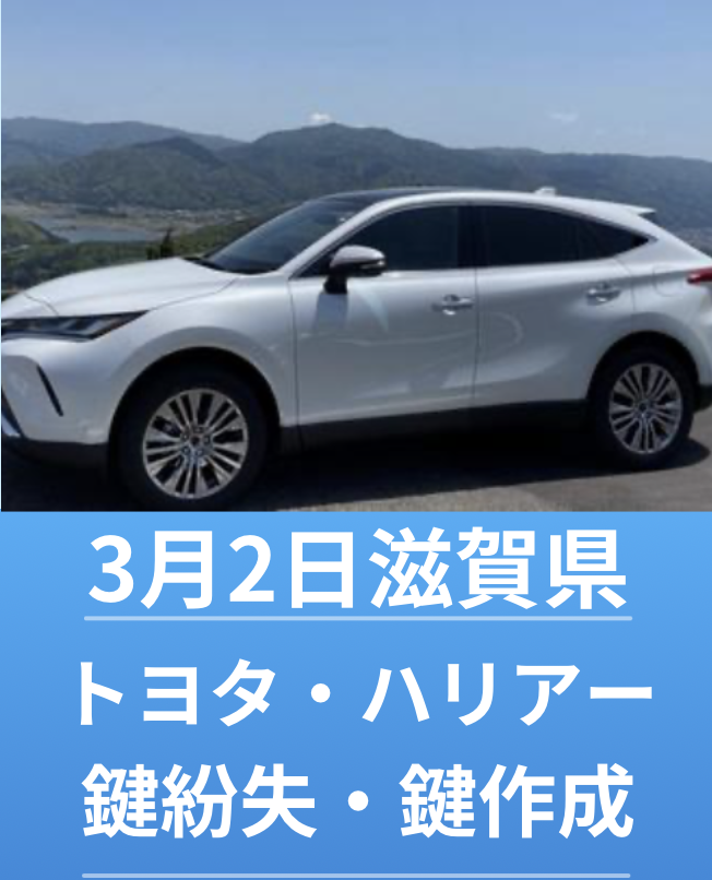 滋賀県南草津市にて、トヨタ・ハリアーの鍵紛失してしまいましたが、すぐに駆けつけてくださり、とても丁寧で感謝です。ありがとうございました! 20代 佐藤様